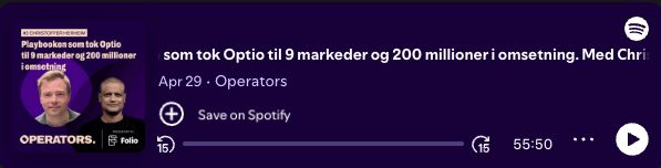 Podcast som GTM-verktøy. Optio har egen nisjepodcast om aksjeinsentiver. Sjefen for Breitlings konsernledelse hørte 3-4 episoder før første møte. NatWest, CVC og Partners Group bruker den i due diligence av Optio. Christoffer kan ikke regne hjem ROI direkte, men: "Hvis du isolert sett tenker bredt nok, det kan godt hende at den ROI-en der gjør at det lønner seg å holde med dette her i 300 episoder alene."